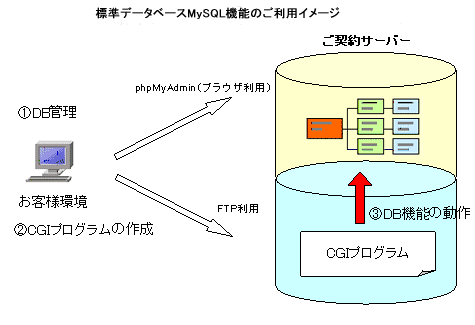 2.の方法は、IT-GuardiansホスティングサービスサーバーにFTPにてCGIプログラムをアップロードしていただき(図中 2)、 そのCGIを通してMySQLデータベースにアクセスする方法(図中 3)です。 CGIプログラムは弊社ではご用意しておりませんので、お客さまにて必要な機能を持ったCGIをご用意下さい。